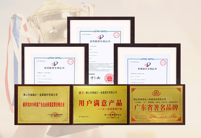 通過ISO9001認(rèn)證,國家建筑材料測試中心和中國有色金屬華南產(chǎn)品質(zhì)量監(jiān)督檢驗(yàn)中心合格檢測,符合美國建筑制造商協(xié)會AAMA2605-98涂層標(biāo)準(zhǔn),被國家建設(shè)部認(rèn)定為建筑鋁合金外墻板、鋁合金天花板定點(diǎn)生產(chǎn)企業(yè)。